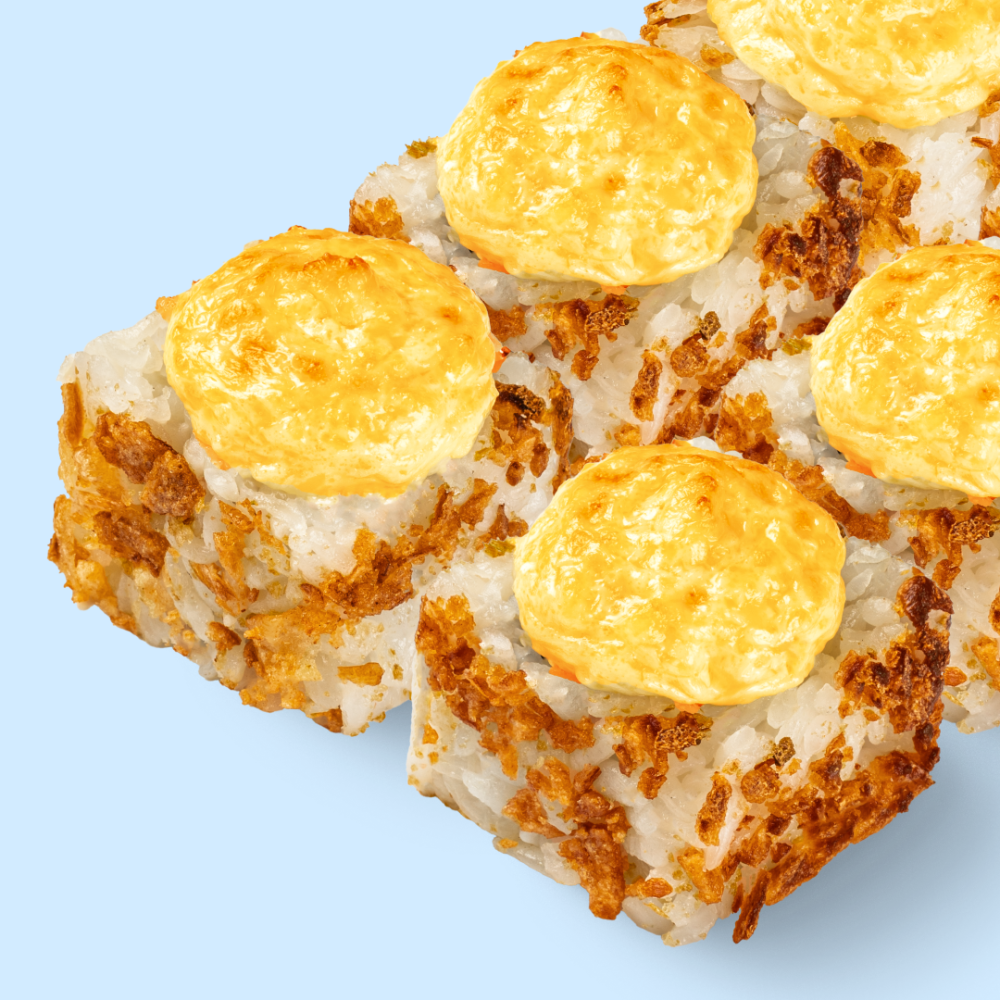 Запечённый ролл с лососем для тех, кто знает толк в хорошей рыбе. Состав: лосось жареный, нори, рис, лук фри, такуан, гауда майонез