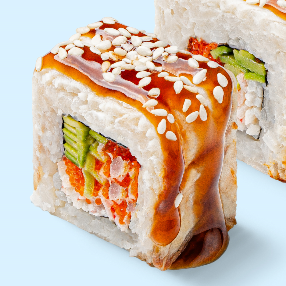 Рис, мицукан, сахар, комбу, соль, нори, авокадо, тобико, снежный краб, угорь, соус унаги, кунжут белый, сыр сливочный
