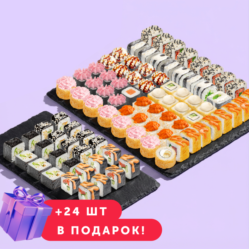 ОН 11 ИЗ 10 — набор, который не влез в десятку, потому что слишком крут! В наборе 64 ролла, а еще 24 идут В ПОДАРОК! Состав: Цезарь Темпура, Лава Темпура, Спешл, Запечённый с Крабом, Сочный Краб Терияки, Яркий Лосось, Чукка Ролл, Ойси Сяке, Каппа Маки, Сяке Кунсей Маки, Тамаго Маки.