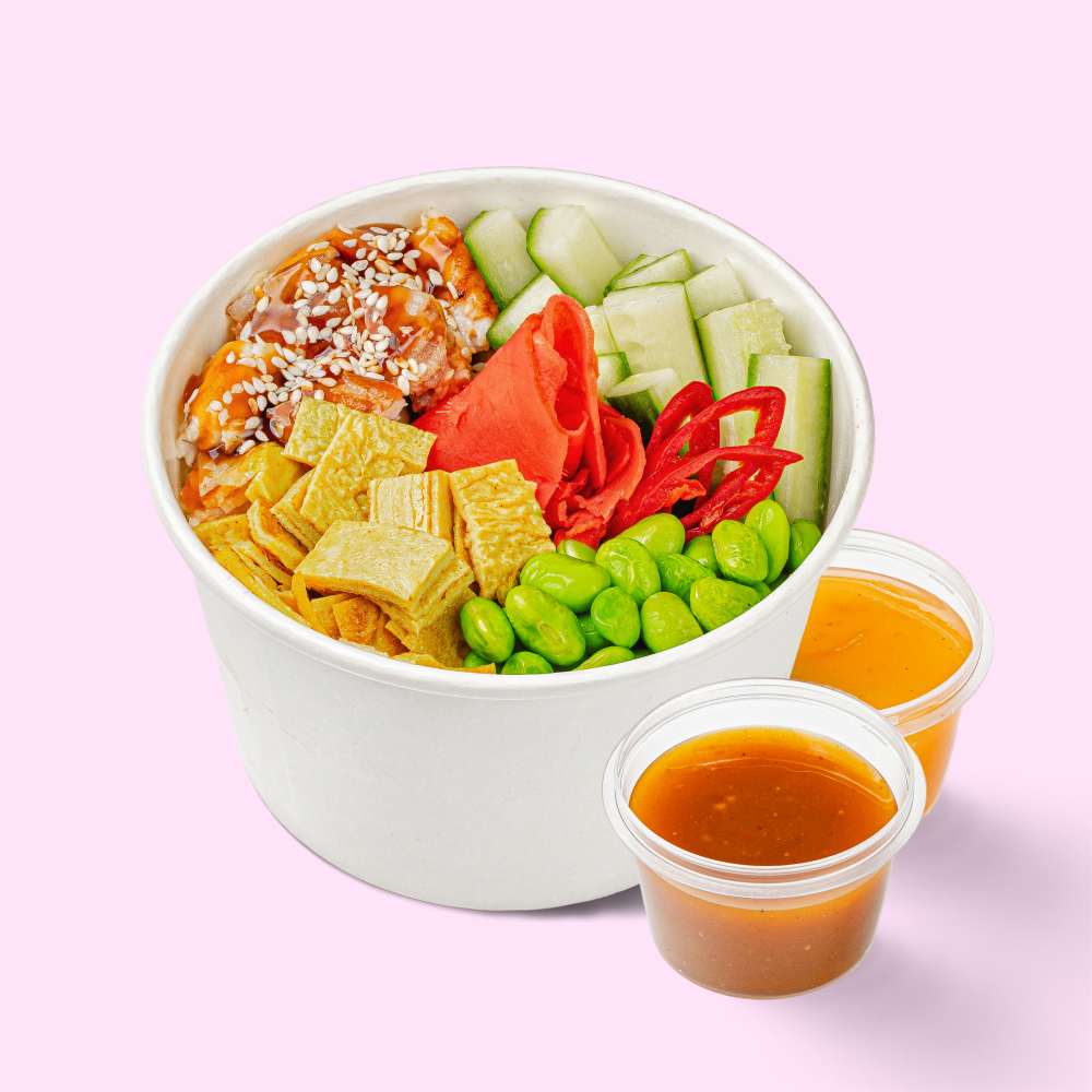 Гавайский витаминный салат с угрём. Состав: рис, угорь, тамаго, огурец, эдаме, имбирь маринованный, перец чили, соус унаги, кунжут белый, соус свит чили / устричный