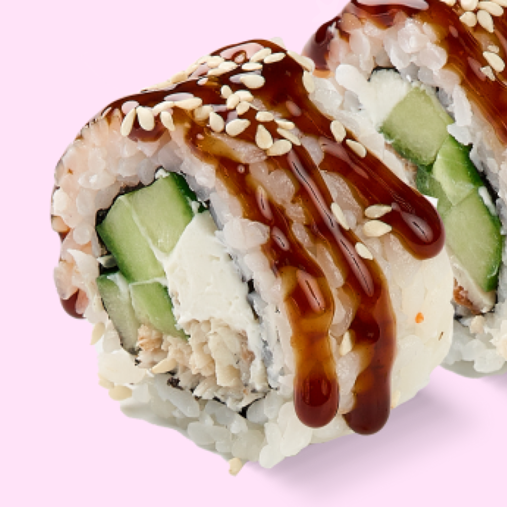Рис, мицукан, сахар, комбу, соль, нори, сыр сливочный, огурцы, угорь, кунжут, соус унаги